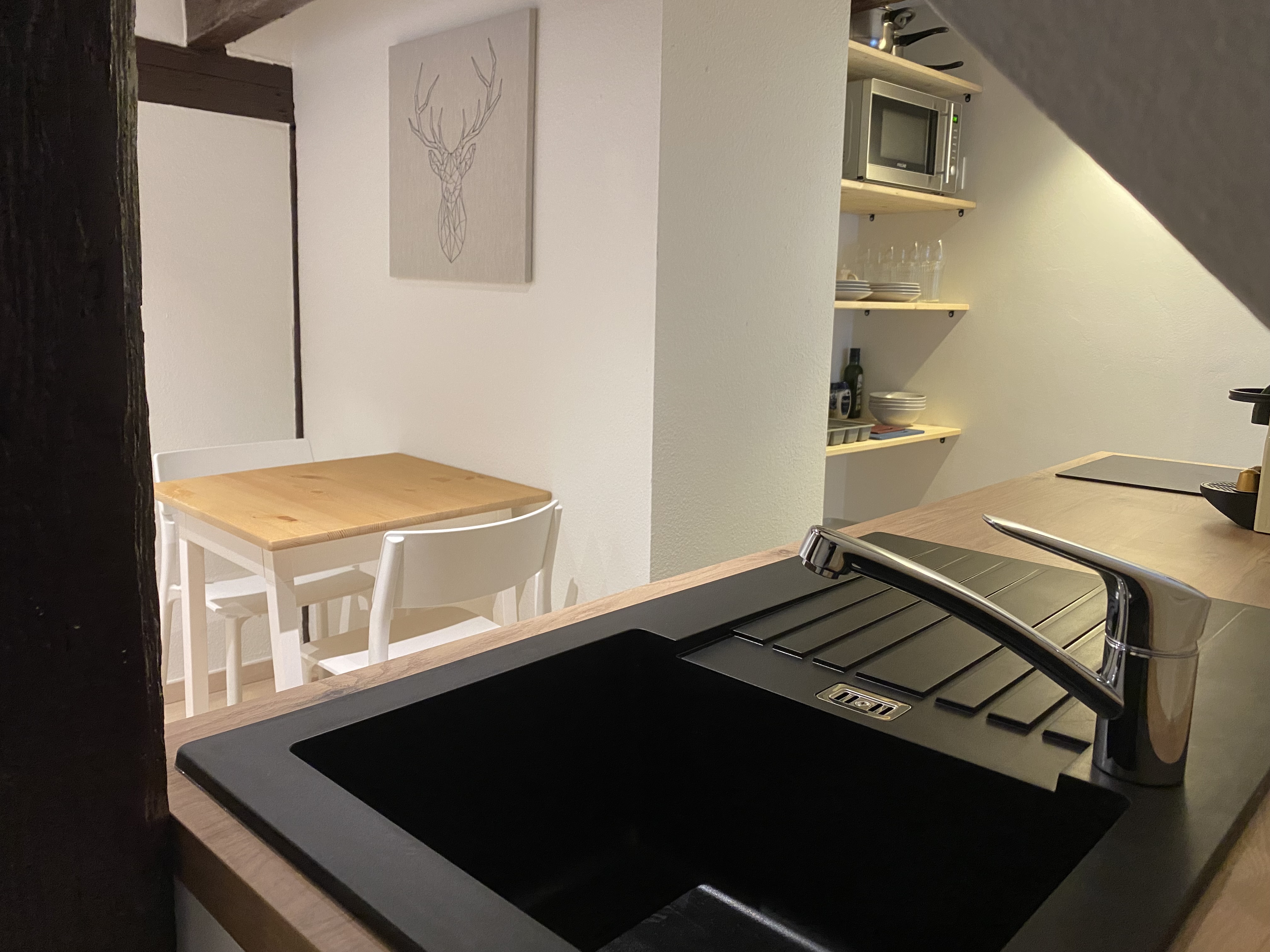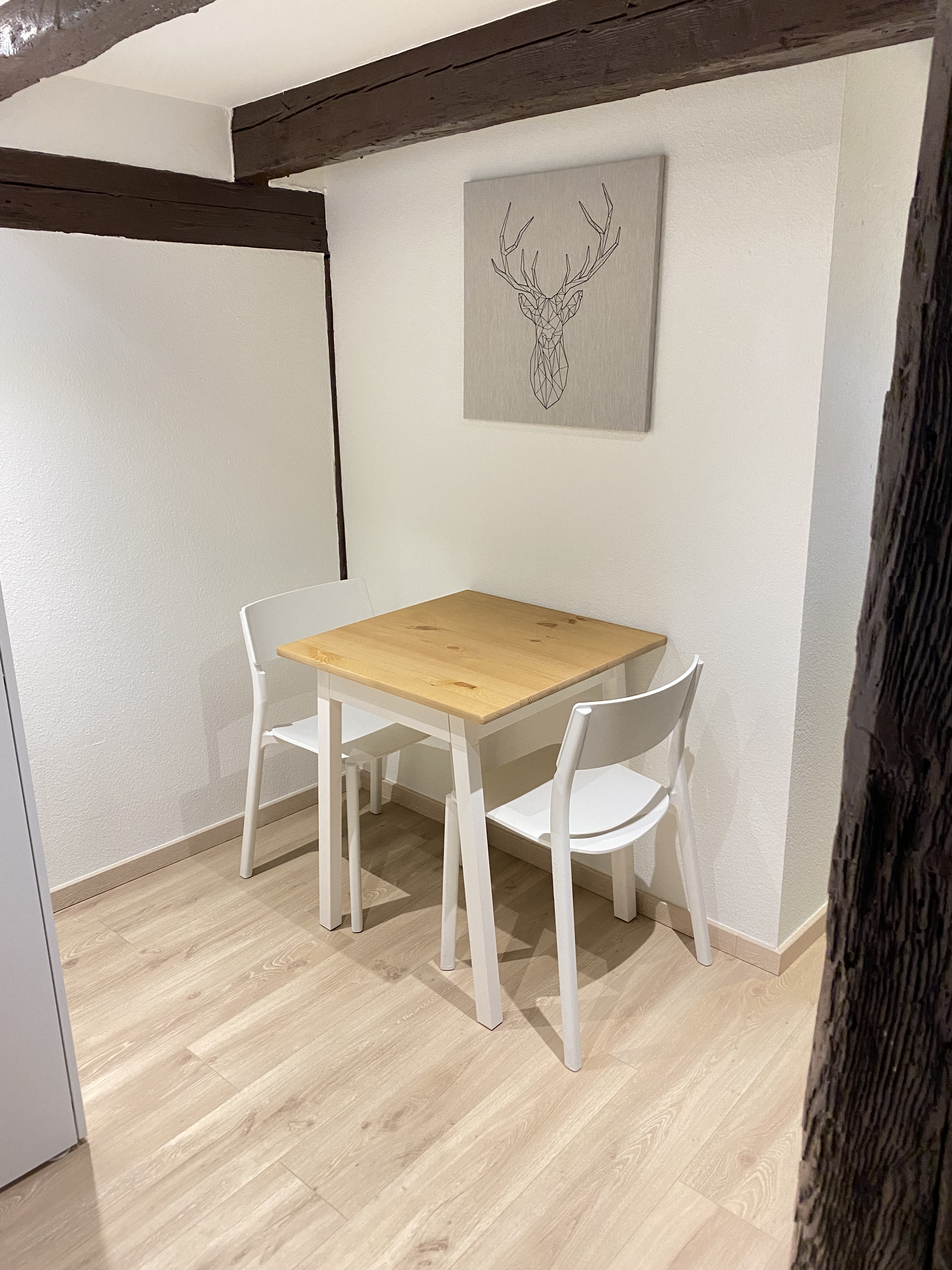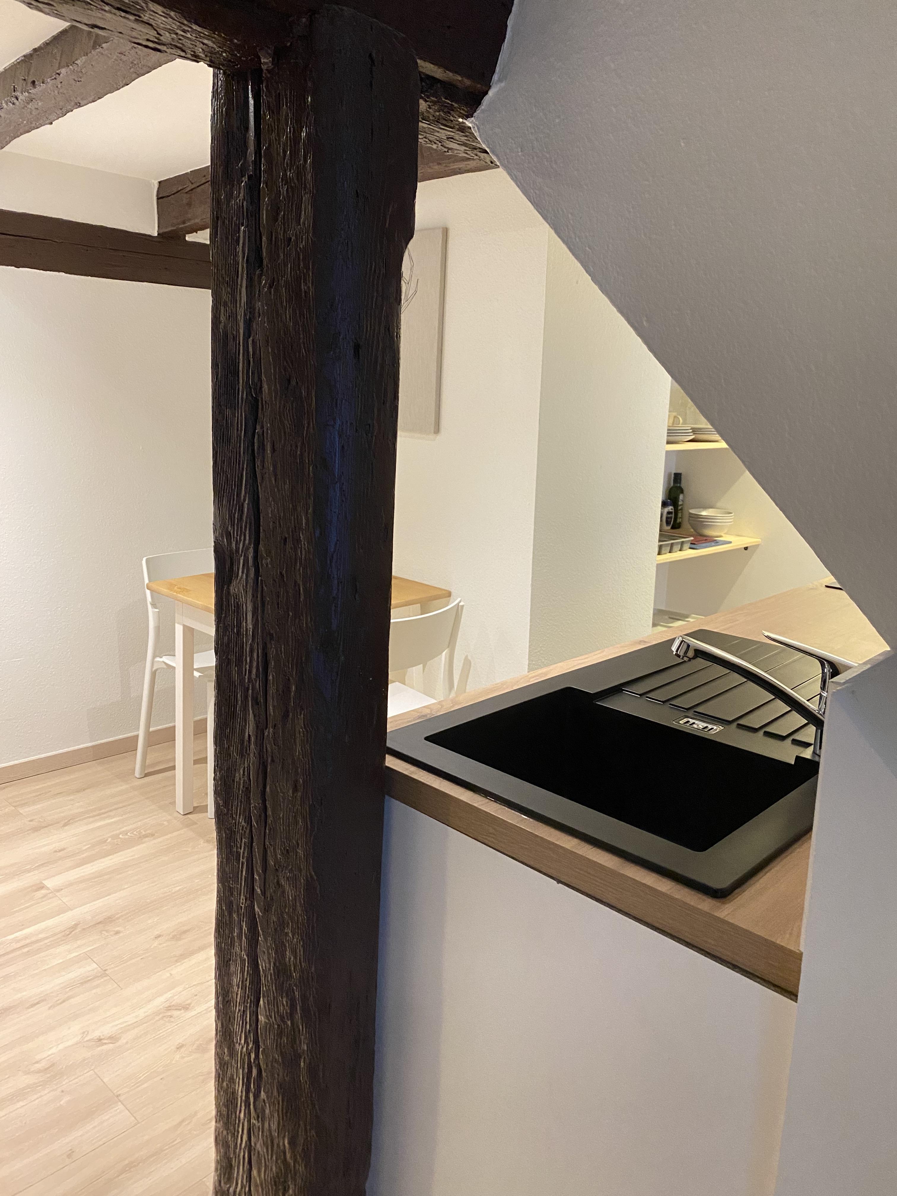 The Studio Helene is a beautifully designed 25m² (270 sq ft) apartment located in the heart of Strasbourg in a very old building, offering an exceptional location in the city. This elegant space features a cozy bedroom with a Queen-size bed (160 cm wide) and a large 50-inch TV, a fully equipped separate kitchen, and a modern bathroom with a walk-in shower. For your convenience, the apartment also includes a washer-dryer.